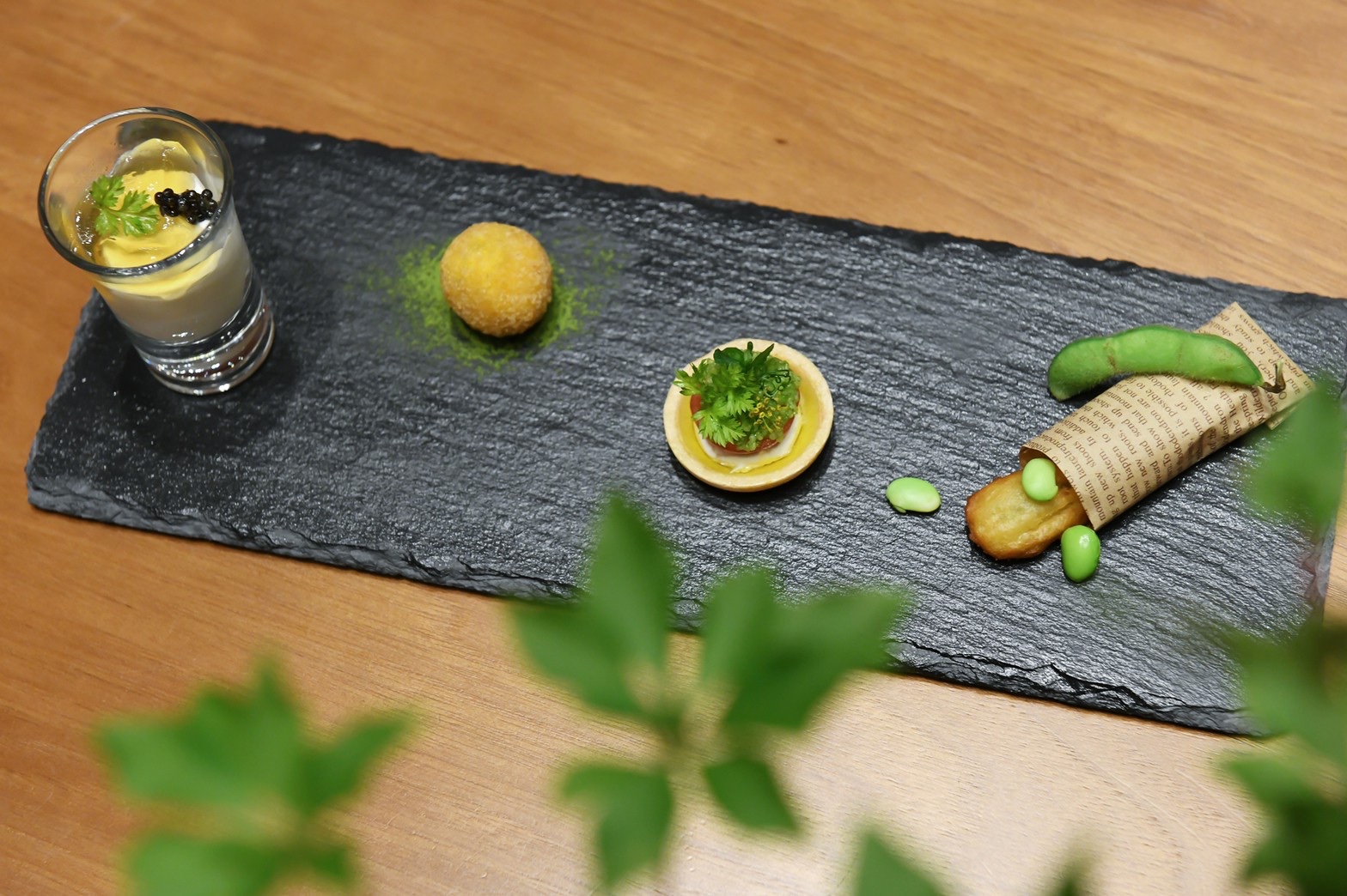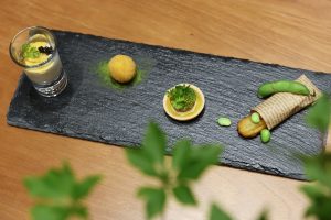 食前のお愉しみ4種(峰岡豆腐・有機トマト・茶豆チュロス・牛タンと静岡茶のクロケット)