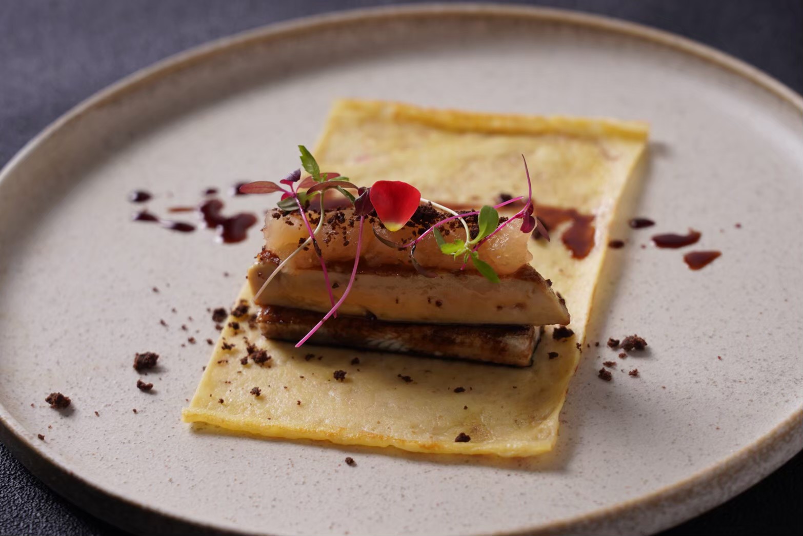 食材をクレープで巻いて、召し上がっていただくこのメニューは、ファアグラと鰻の上のりんごがポイントとなっています!