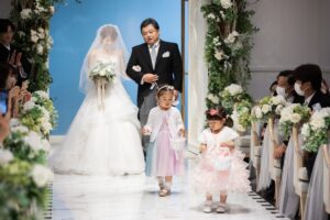 花びらをバージンロードにまきながら花嫁を先導するフラワーガール・ボーイ。