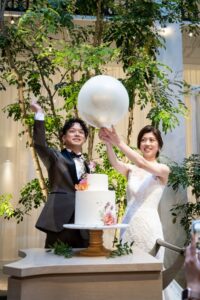 披露宴ではおしゃれなケーキにバルーンをスパークして