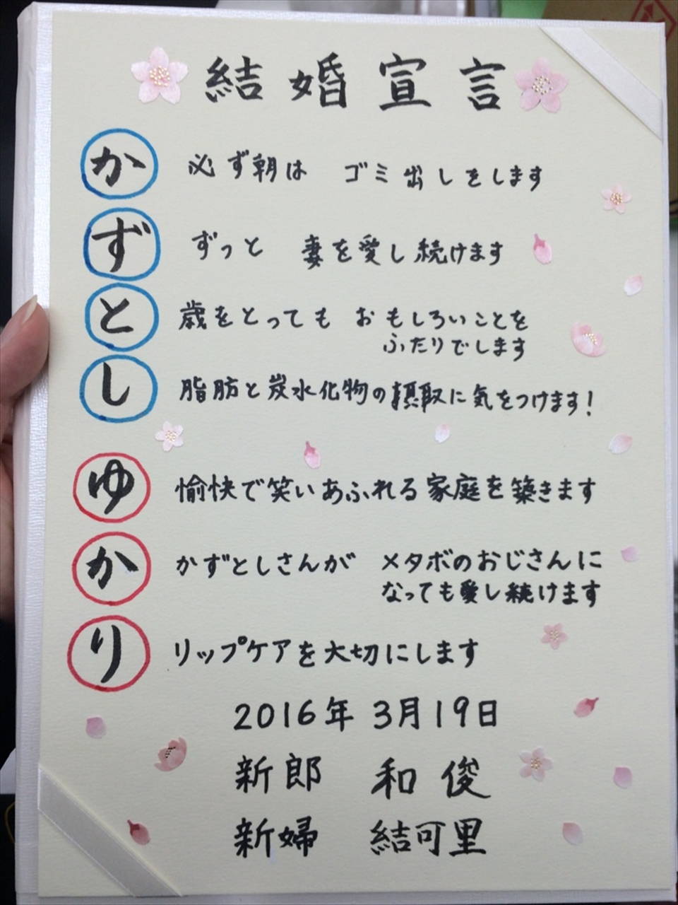 新郎新婦それぞれのお名前を文のスタートの文字とし