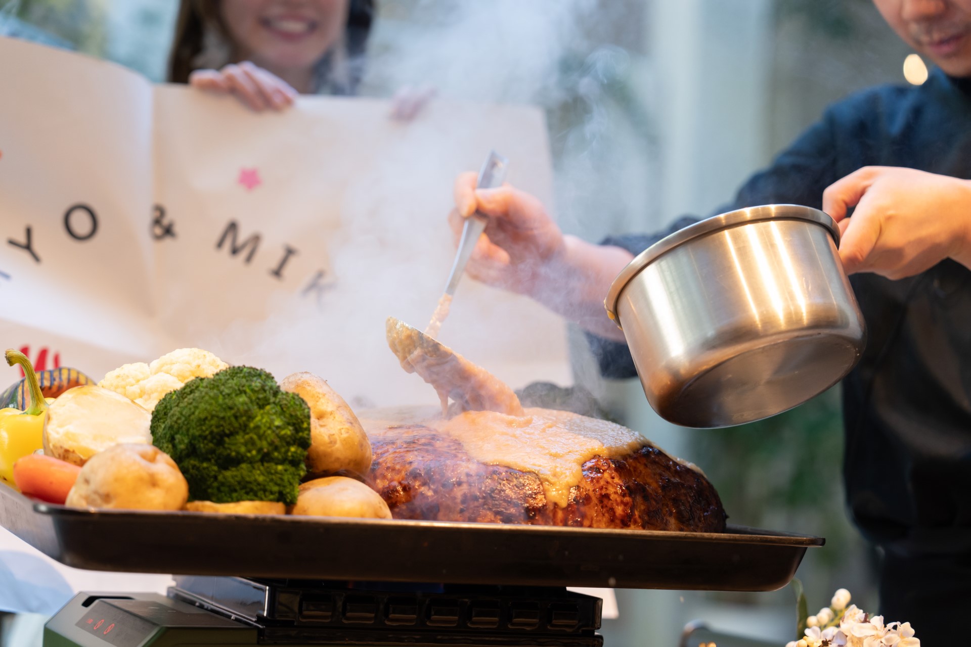 おふたりのだいすきなハンバーグに入刀セレモニーです
