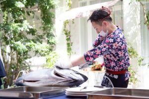 シェフと厨房スタッフが、実際にゲストの目の前で解体から刺身にするライブキッチンができます!