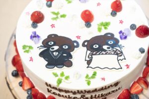 ケーキは大学時代のサークルのマスコットをモチーフに