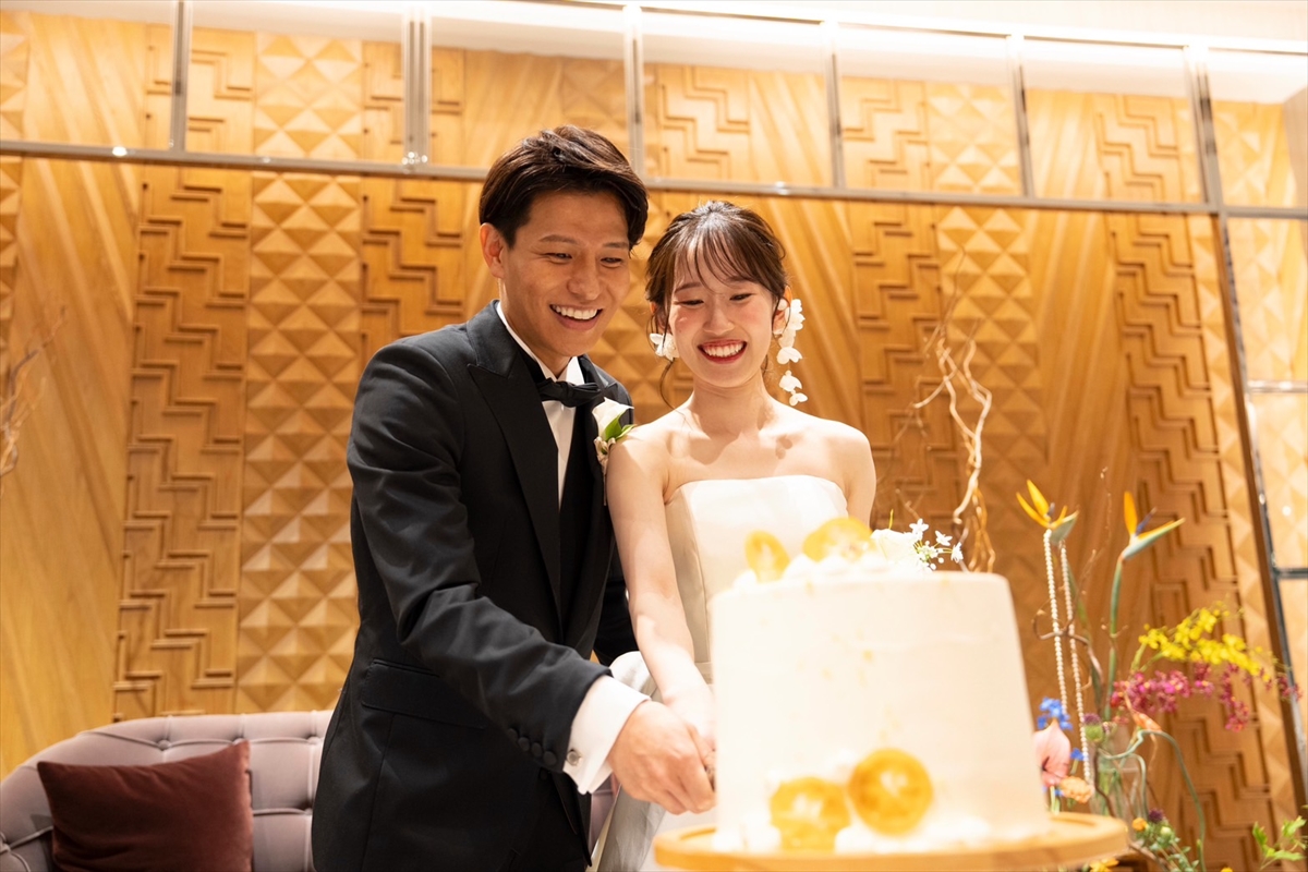 おふたり仲良く入刀した後はファーストバイト♡