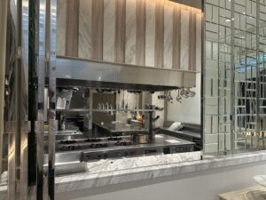 炎をあげる演出を使うガラス張りのオープンキッチン、こちらではお料理の香り、お皿の雑音などが披露宴会場に入らないように防音でなっております。