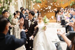 フラワーシャワーで祝福をうけ披露宴へ