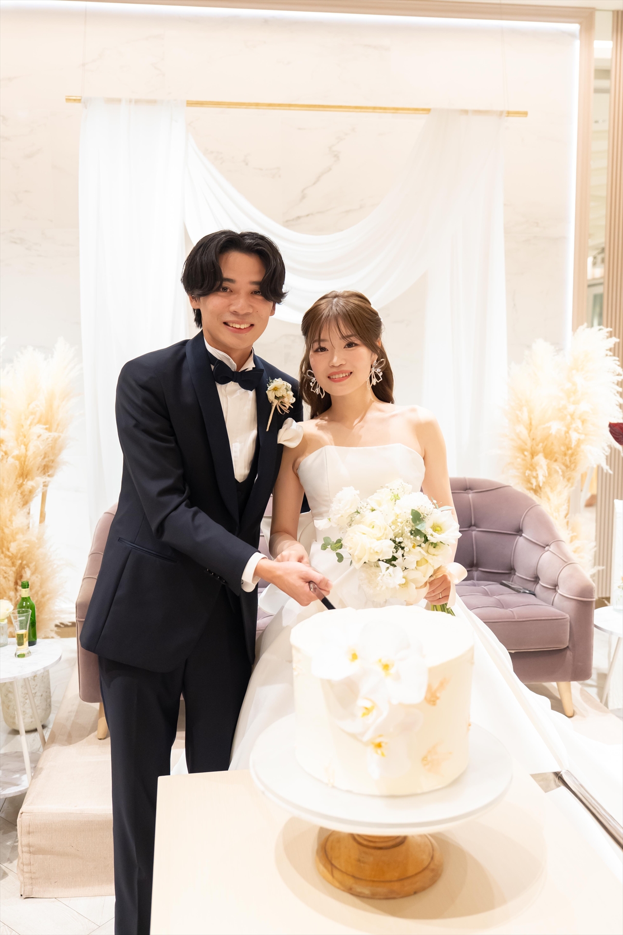 おふたりのケーキは胡蝶蘭とお花のデザインが施された