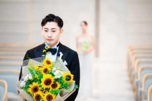 こちらのお写真では夏の代表的なお花【向日葵】を抱えた新郎