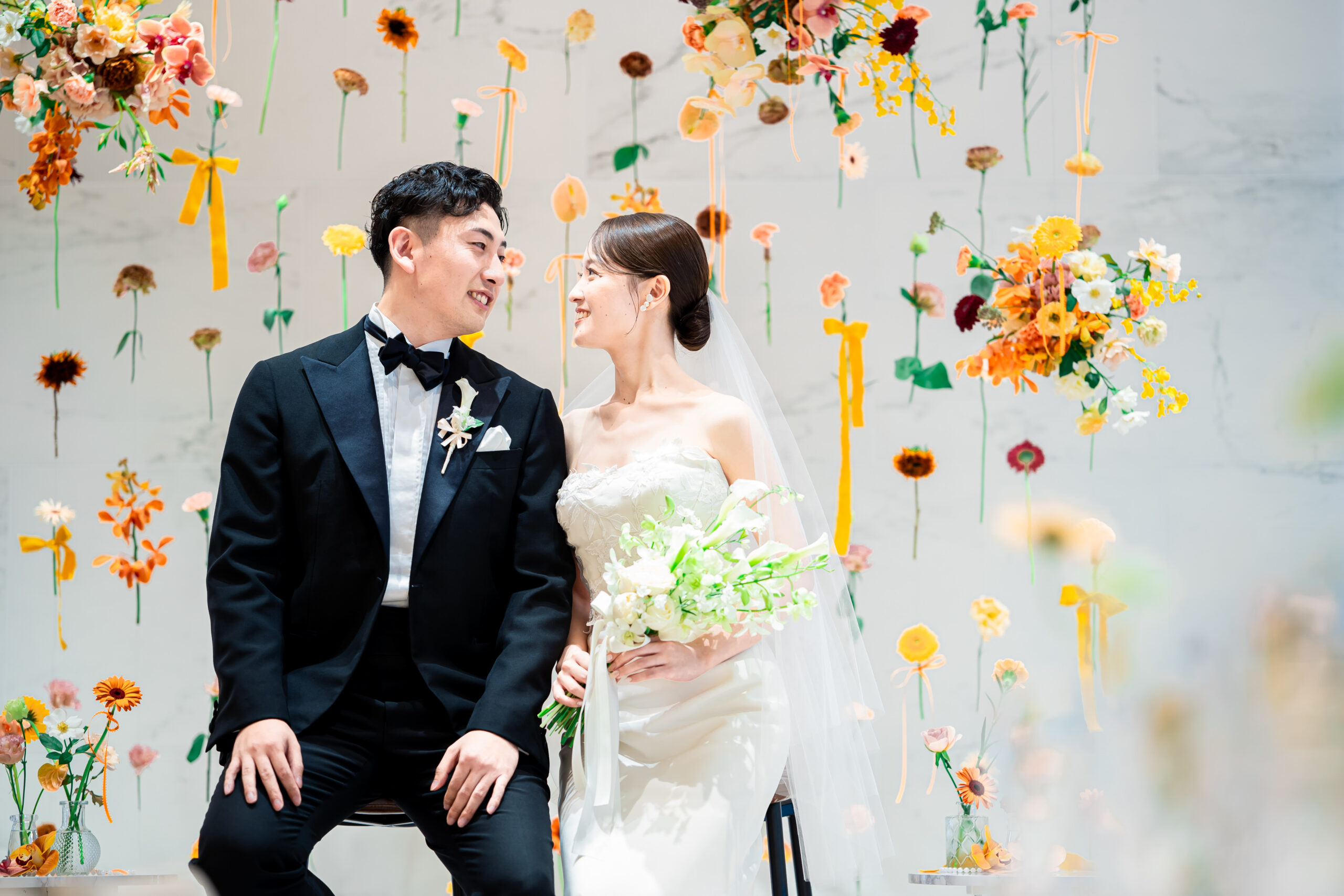 おふたりのバックにはお花のカーテンが彩られたコーディネート