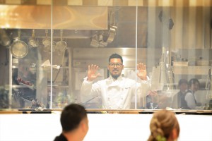 キッチンオープンではたつやさんのフランベパフォーマンス!