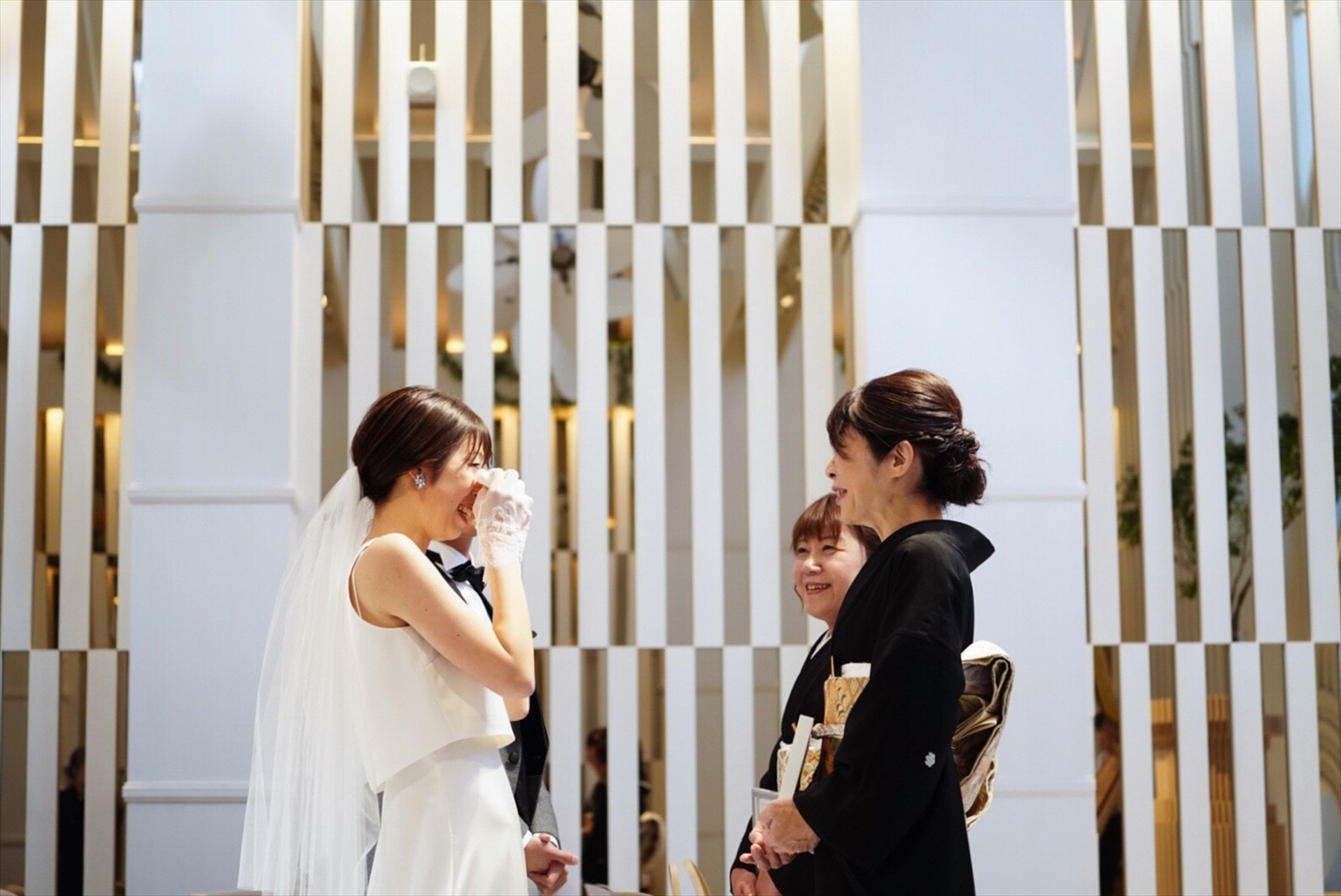 心地よい秋風が吹く本日 ラピスコライユに幸せなご夫婦が誕生しました 新郎 なつきさん 新婦 まささん大学時代同じサークルで出逢われたおふたり 8年のお付き合いを経てこの日を迎えます おふたりの物語の新たなスタートとなる本日 まずは【 家族対面 】からはじまります 20年以上おふたりの事をたいせつに 心を込めて育ててくれたお母様に おふたりから感謝の想いを伝えます