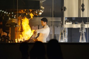 厨房からゆうたさんがフランベのパフォーマンスをして