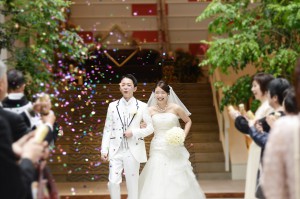 クラッカーシャワーと祝福の言葉がおふたりに降り注ぎます