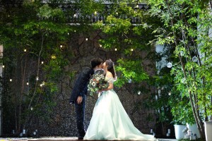 お色直しの入場ではエメラルドグリーンのドレスにチェンジ!