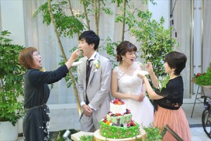 中庭でのシャボン玉シャワーやブーケプレゼント