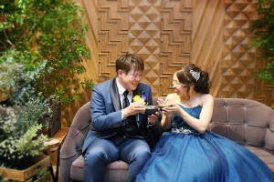 ブルーのタキシードと 光に照らされ輝くドレス姿に