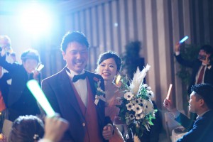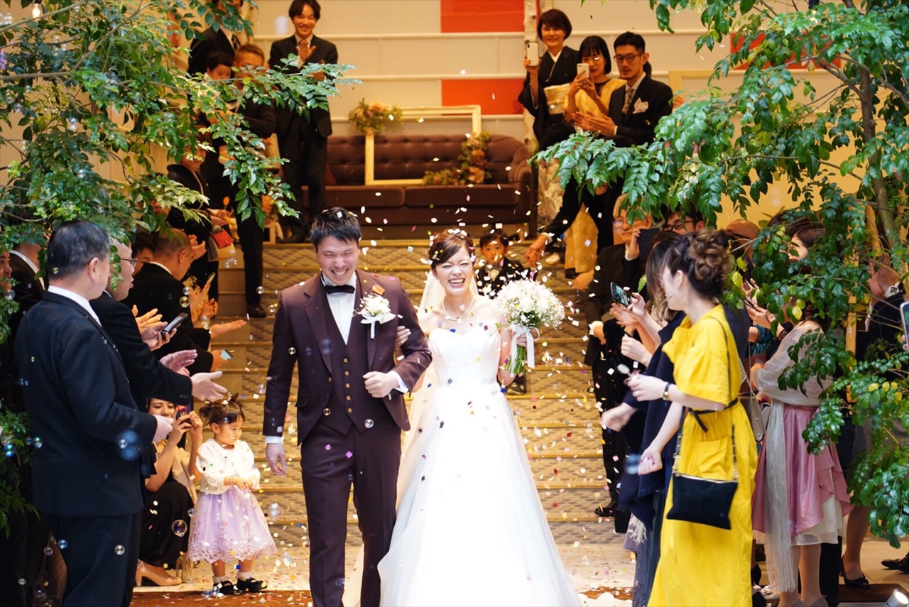 祝福の「おめでとう」とペーパーシャワーがおふたりを包みます