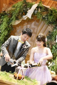 新郎新婦がひとつの瓶に協力してお酒を注ぎます