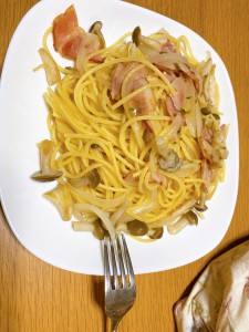 最近作ったのがキノコとベーコンのペペロンチーノです!