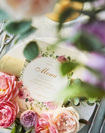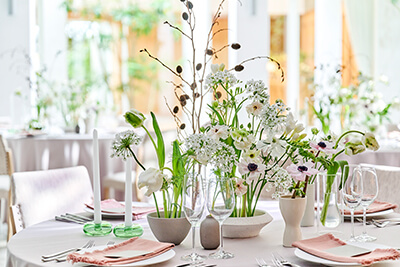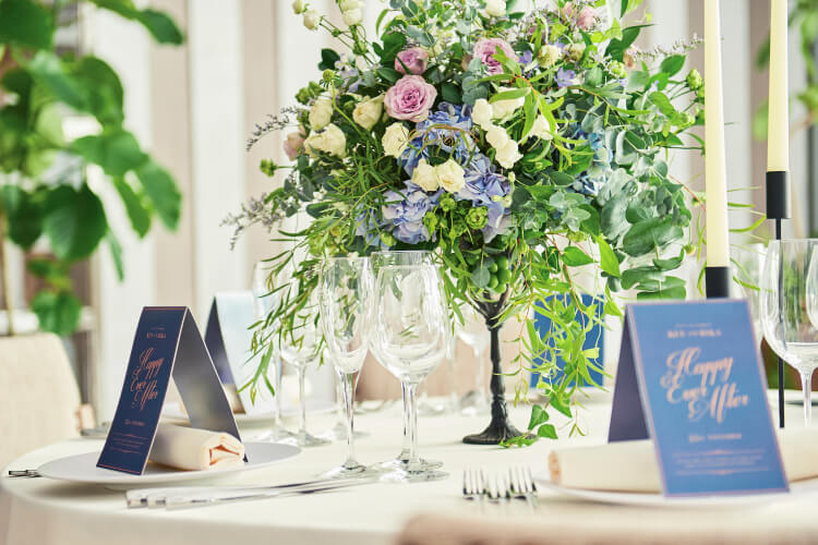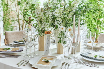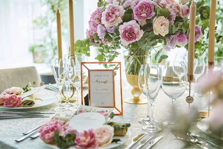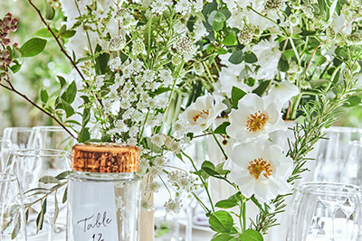 併設のフラワーショップがあるので会場の個性を知りつくした装花提案が可能に。産地や生産者にこだわって仕入れた季節の生花で仕上げる、シーズンに合わせた装花アレンジも魅力。
