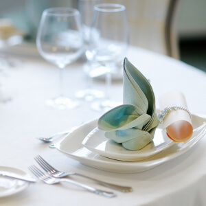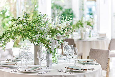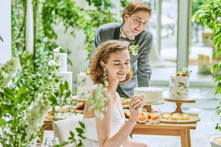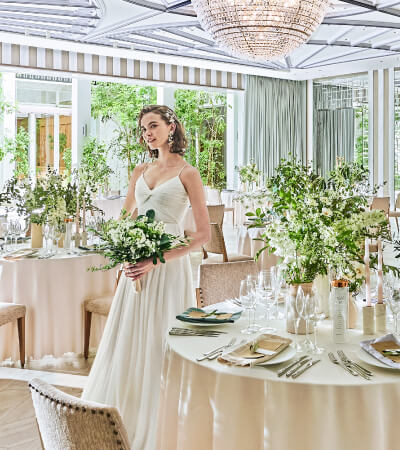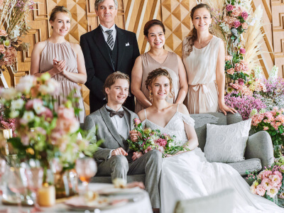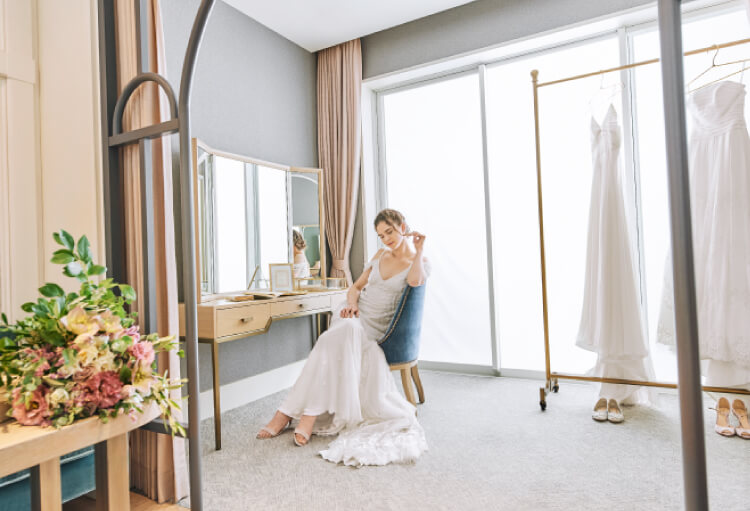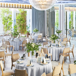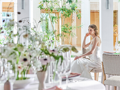 大きな窓から明るい光が差し込む、テラス付のお部屋。挙式前のお仕度はもちろん、パーティを終えた新郎新婦が、改めておふたりでゆったりと食事を楽しむ場所にもなります。