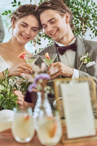曲線をモチーフにした寛ぎのスペース。写真や趣味の小物などでおふたりのことを紹介したり、 ゲスト参加型のイベントを組み合わせるなど、会話のはずむひとときが楽しめます。