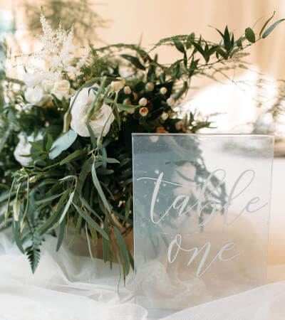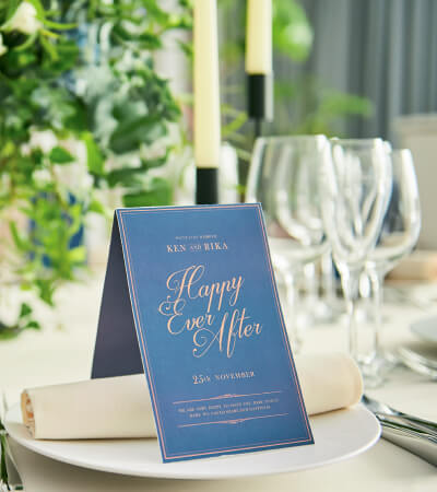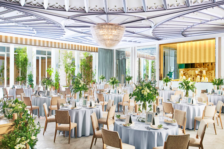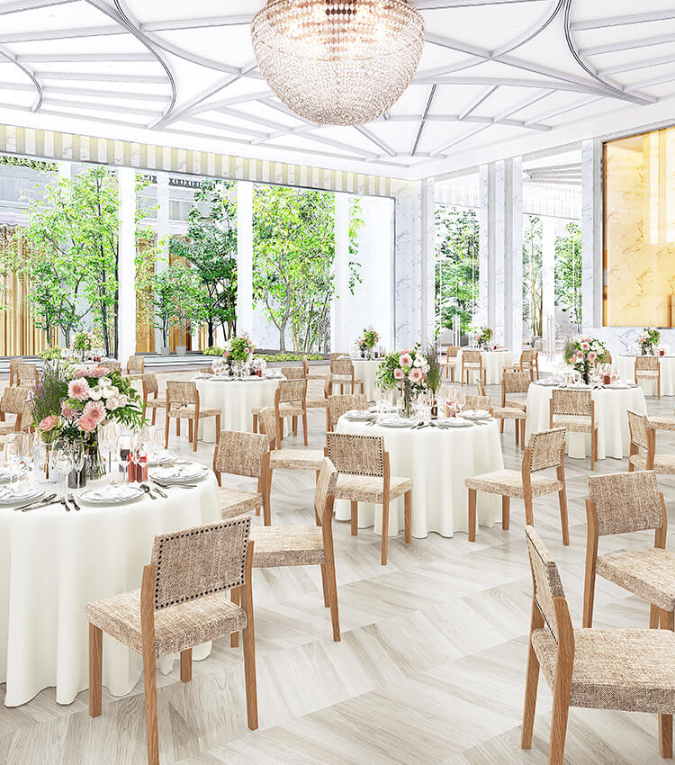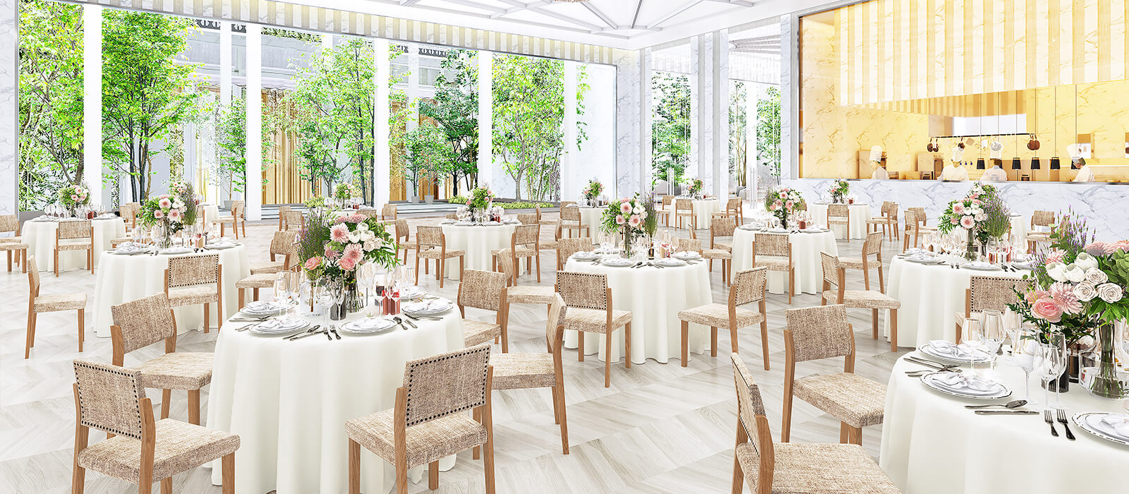 白を基調とするインテリアへとリニューアル。より多彩なコーディネートに映えるよう、天井もスッキリとしたデザインに。おふたりの席周りも明るく華やかな雰囲気に生まれ変わります。