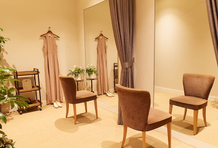 館内に6部屋用意されているゲストルーム。寛ぎを追求したインテリアや、全身を映せる大きな鏡など、お着替え時にも快適に過ごしてもらえるよう細部にまで配慮しています。