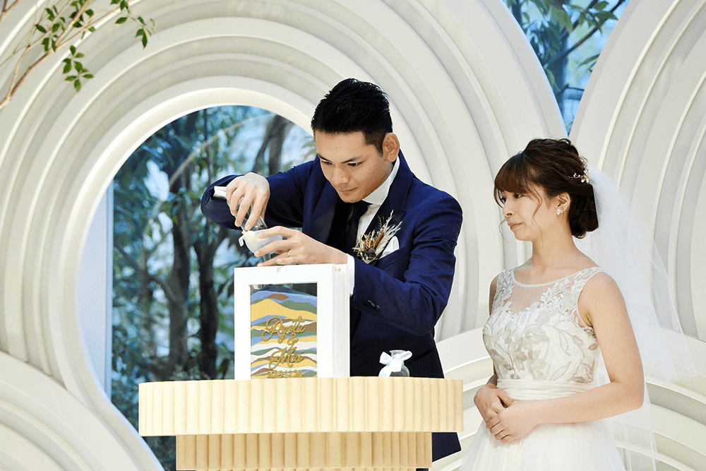 ②人前式での「サンドセレモニー」とバレーボールチームの先輩からの「選手宣誓風の成婚宣言」