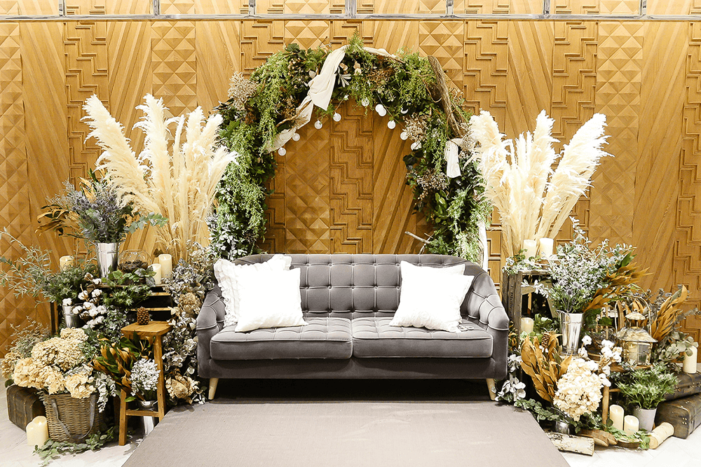 ①ドライフラワーを使った会場コーディネートやブーケ、ヘッドアクセサリー