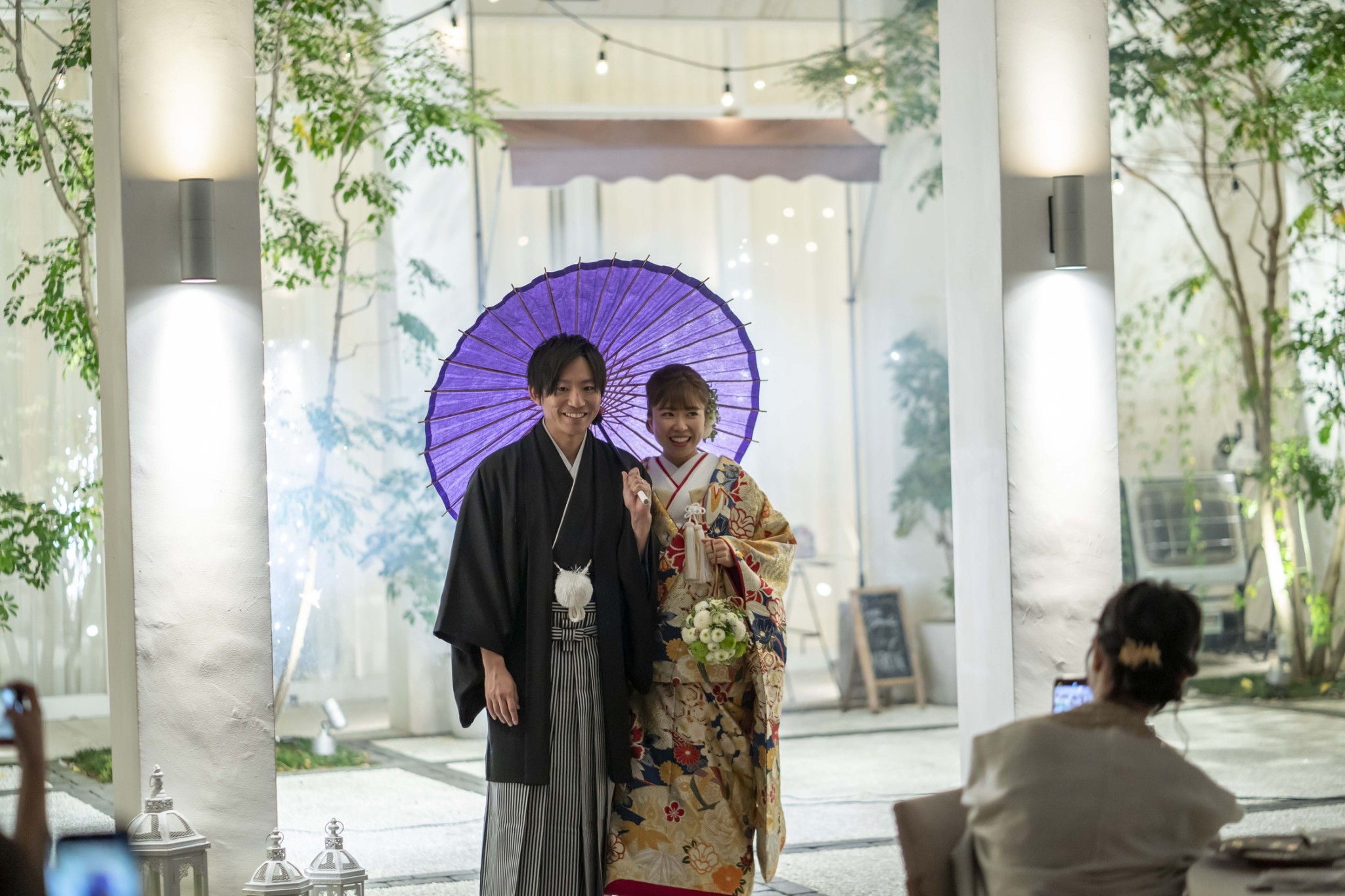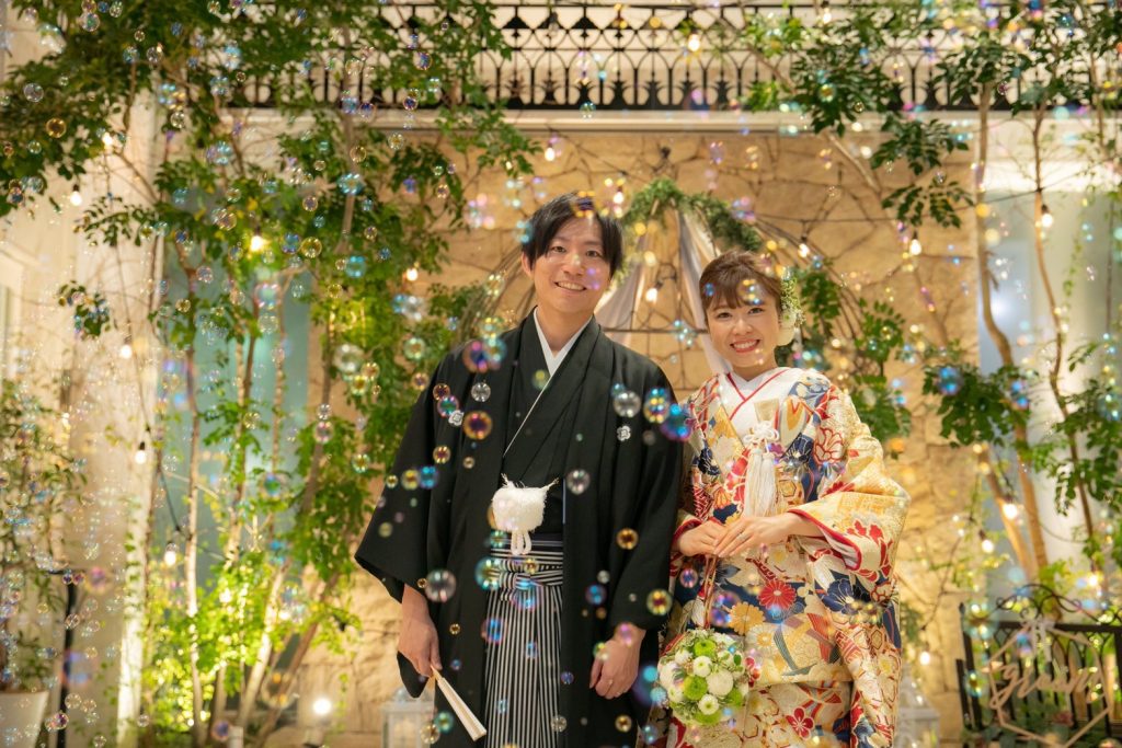 会場コーディネートはお色直しが和装だったので、「BGM・和・ナチュラル」を取り入れたリメイク入場を行いました。ソファのコーディネートを和アレンジをして、花火の中から入場を行いました。番傘をあげるタイミングと曲のタイミングを何度も練習して、当日はタイミングばっちりでしたね!