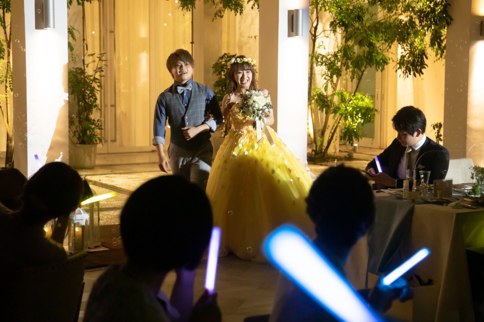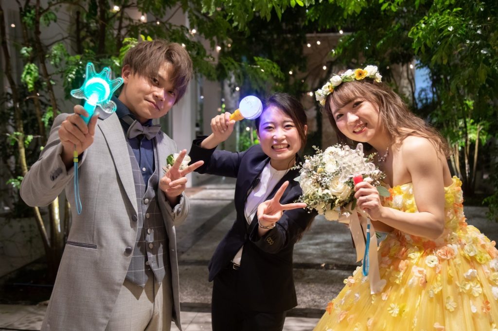 おふたりのお打ち合わせは、毎回笑いが絶えず本当に楽しかったです。特にこだわって考えたお色直し入場は、おふたりが登場するタイミング、曲のタイミングを何度も考えました。ゲストのみなさまだけでなく、スタッフもペンライトを持って一緒に結婚式を盛り上げました。