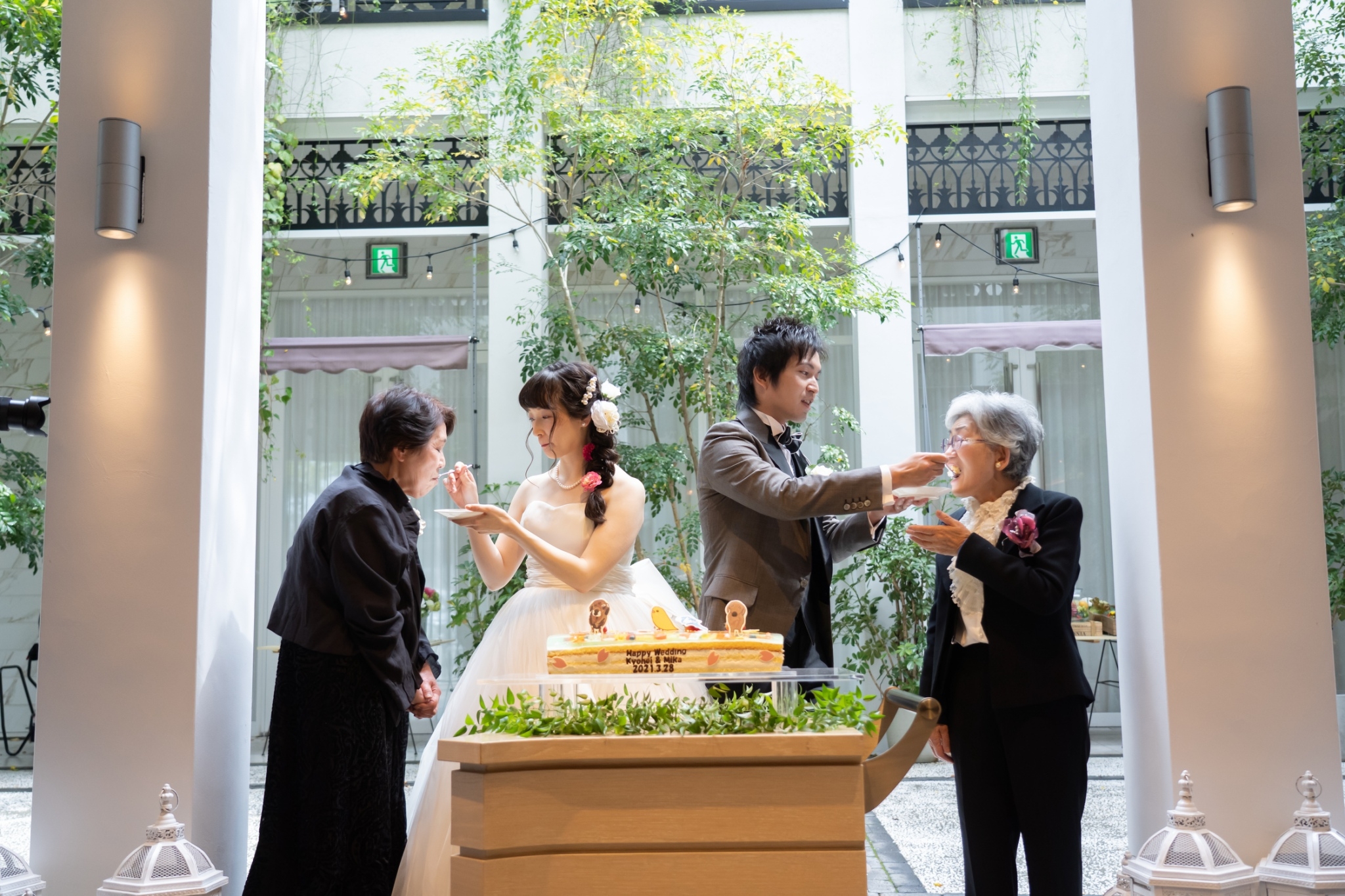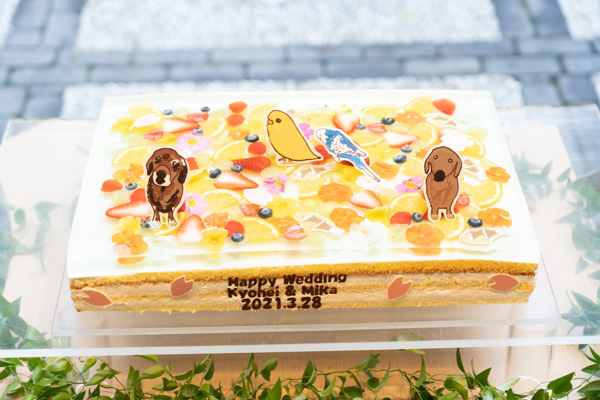 また、ふたりの実家で飼っているペットをリングドックで登場させたり、ウエディングケーキに犬やインコ、クマノミなどのも飾りました。ふたりらしい、アットホームな演出になりました。