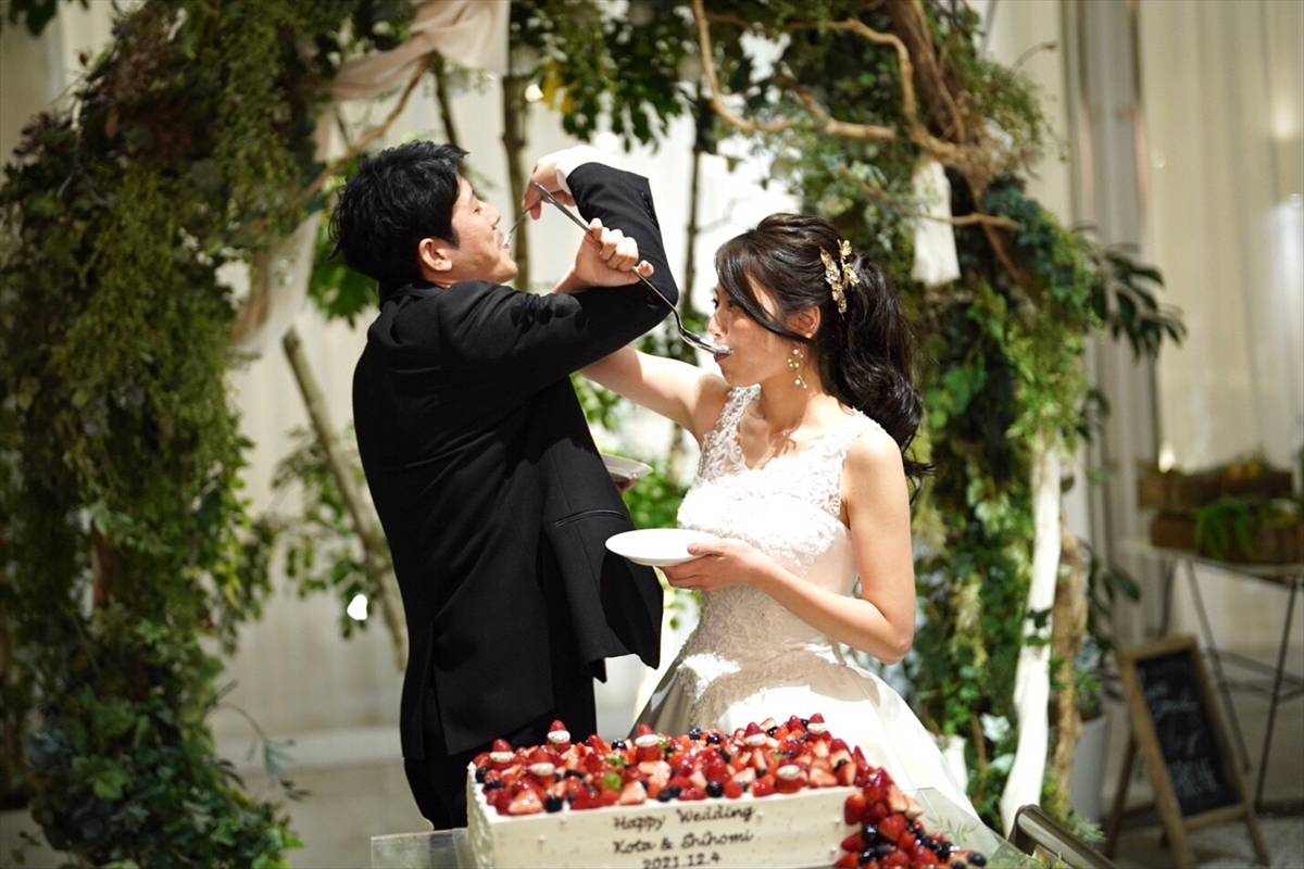 いちごいっぱいのウエディングケーキを、おふたりでファーストバイト!