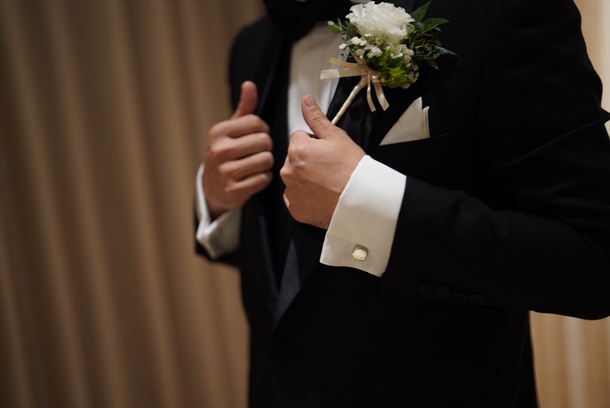 新郎こうたさんもドレスに合わせて小物をチェンジ。