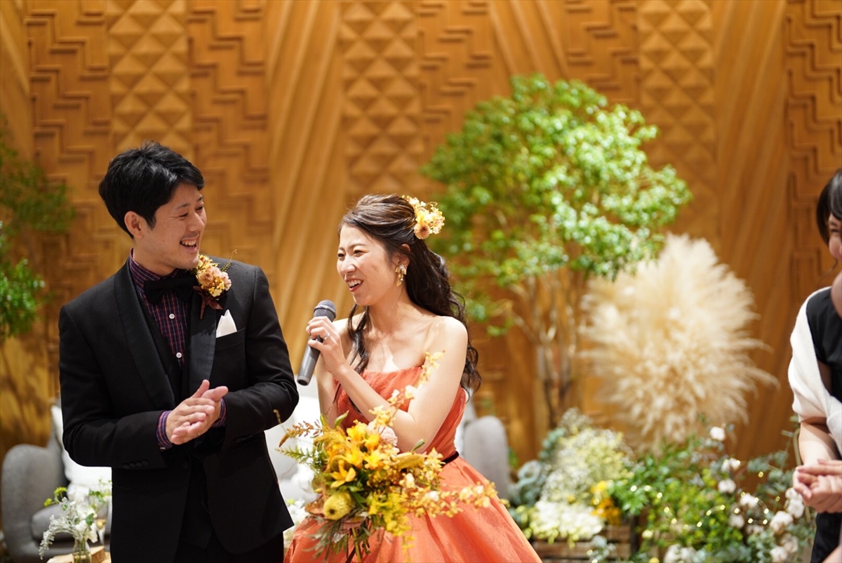お色直し入場は、新婦しほみさんの明るいイメージによく似合うオレンジのカラードレス。