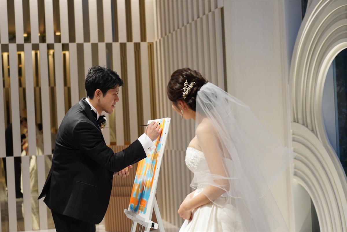 待合室でみなさまに作成いただいた[ウエディングキャンバス]へおふたりがサインをし、世界にたったひとつだけの結婚証明書が完成。