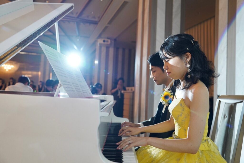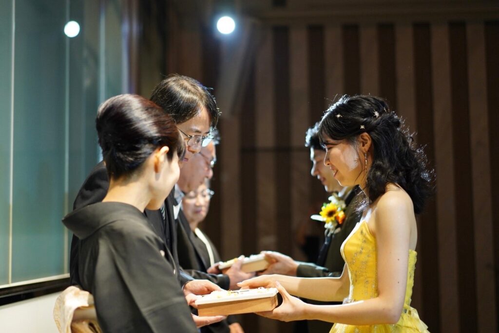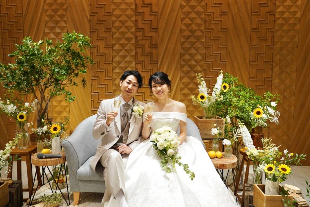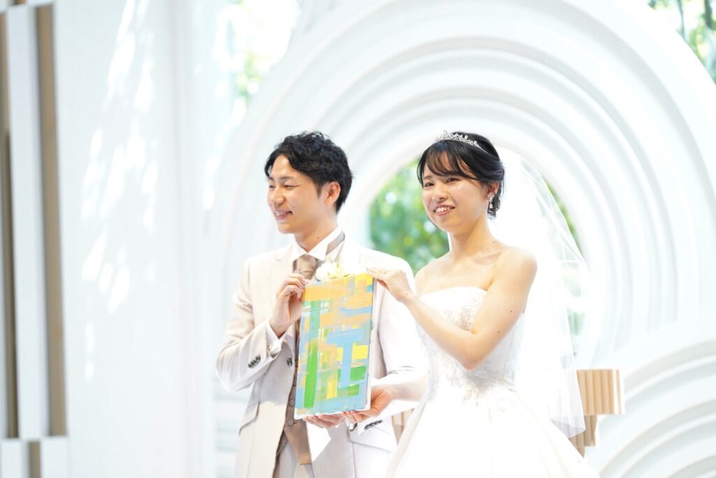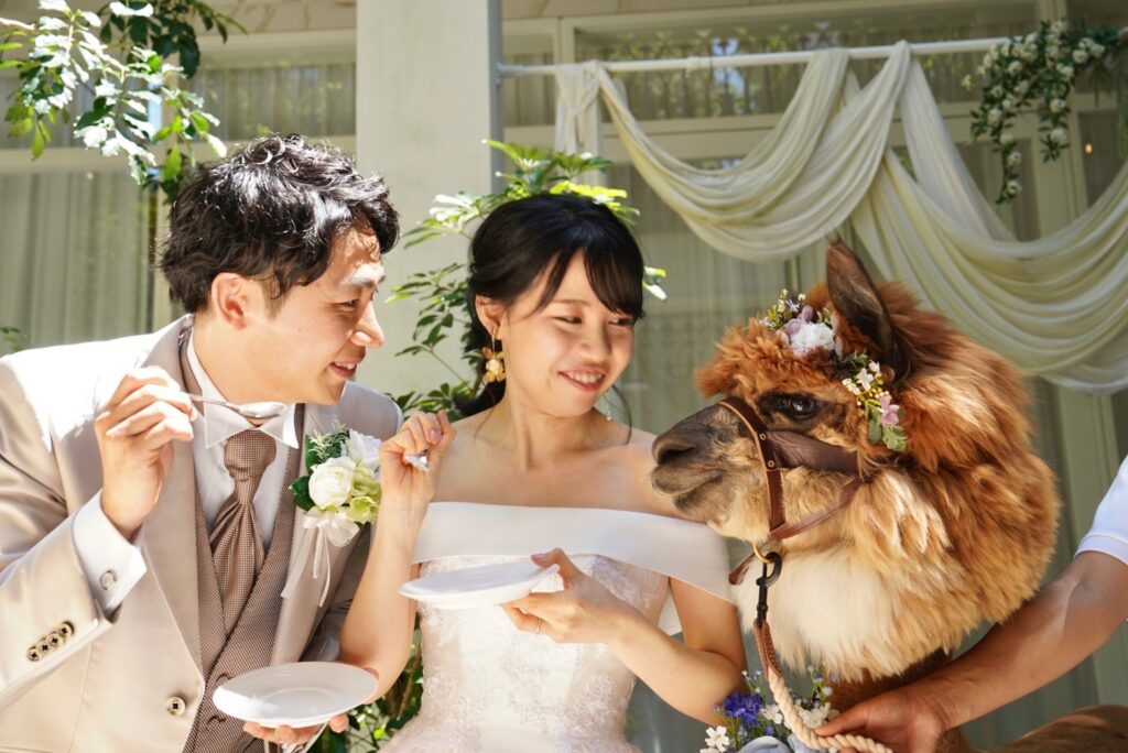 初めてのアルパカウエディングであることはもちろん、挙式にも拘りました。披露宴はアルパカちゃんとのお時間を取ることを優先とし、おふたりらしい様々な演出の一部は挙式に持っていきました。おふたりのことをよく知るご兄弟からの成婚宣言や、賛同の歌、さらに歌詞に出てくる【縦の糸】【横の糸】から連想し、おふたりの結婚証明書はウエディングキャンバスに。一つひとつの演出の意味や繋がりをたいせつにされるおふたりらしい素敵なお時間となりました。