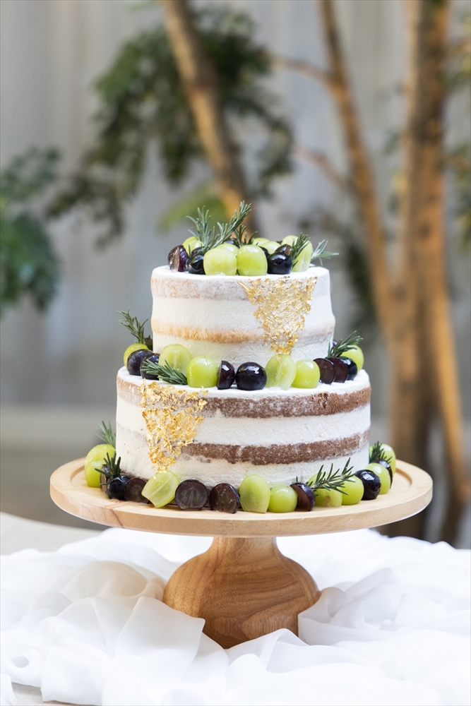 ネイキッドケーキにマスカットとグレープを乗せ、金箔をあしらいました。金箔の乗せ方やクリームの塗り方など細かい部分にもこだわりました。