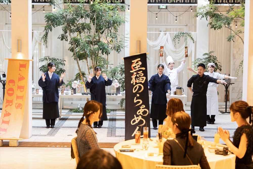 おふたりが大好きな「ラーメン」とみんなが大好きな「甘いもの」を贅沢に2つのビュッフェでおもてなし!醤油や豚骨など本格的なラーメンとパティシエ特製の可愛いデザートが並びます。