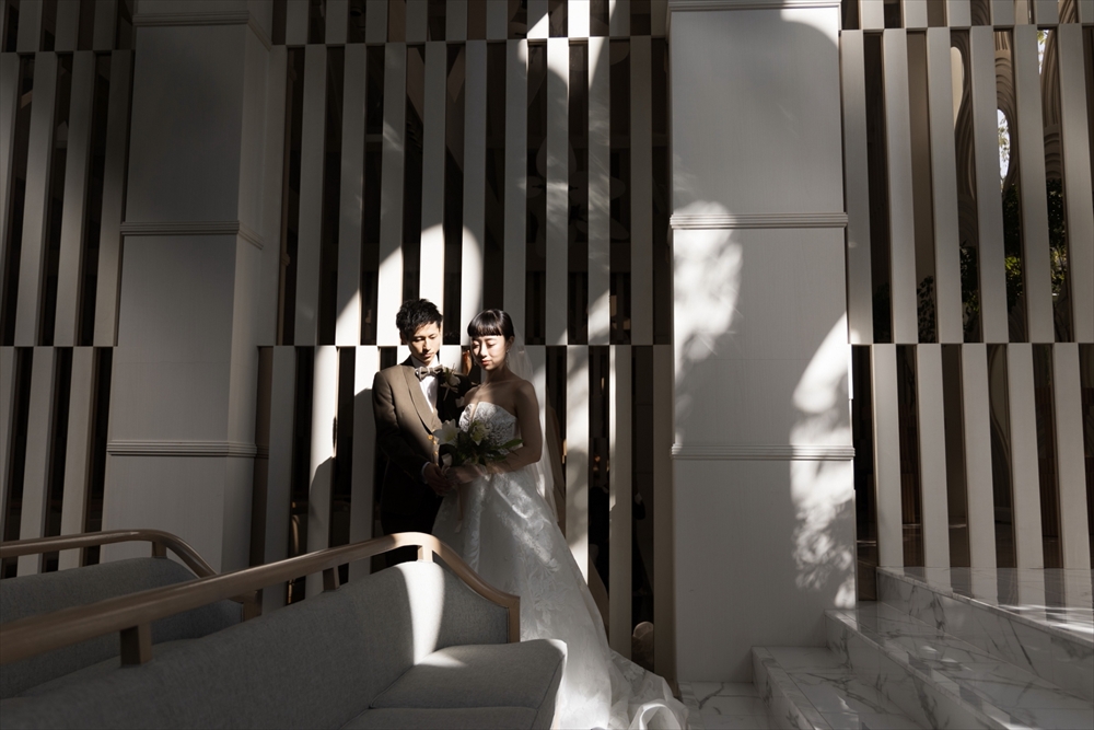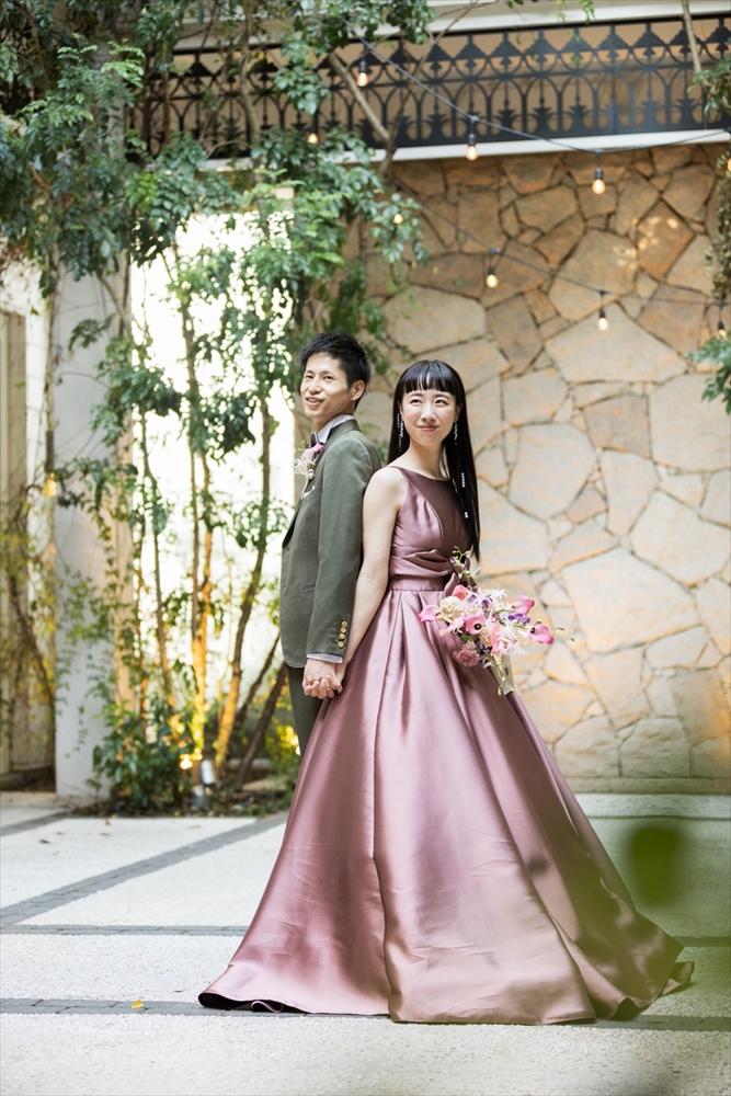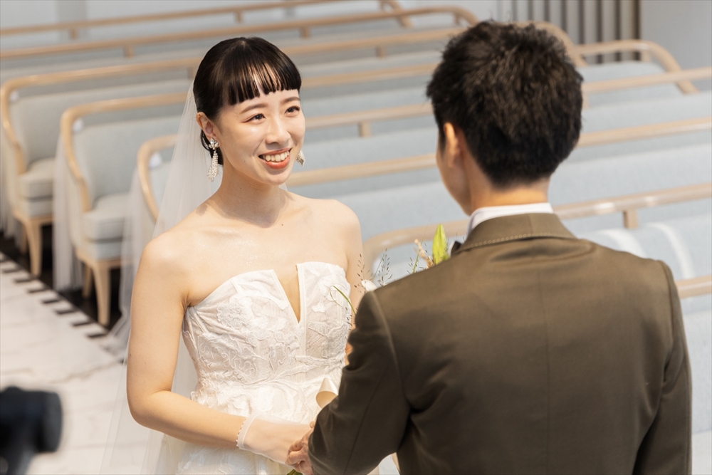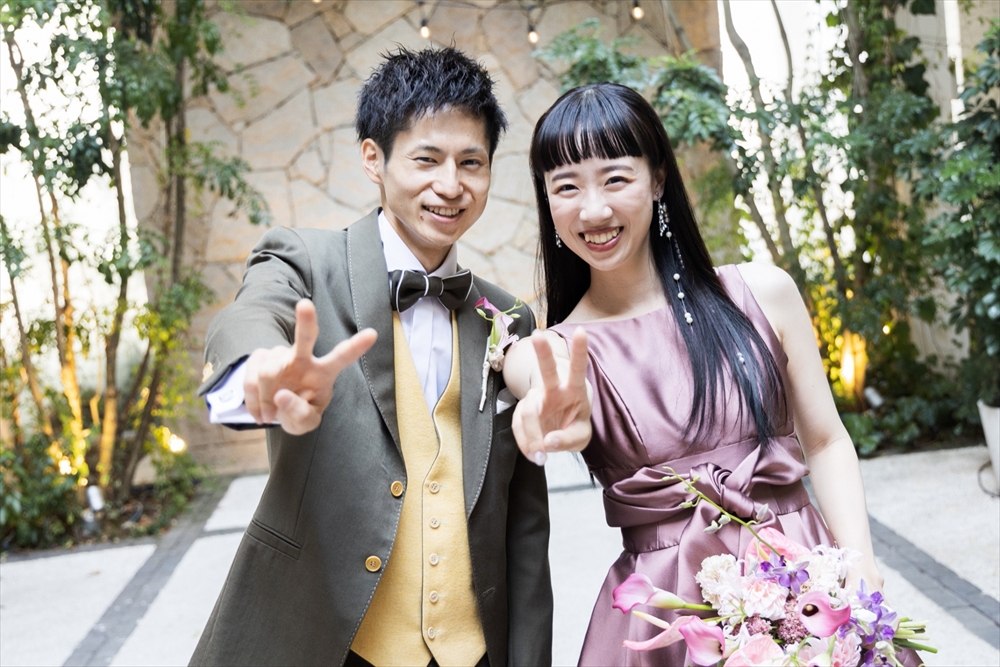 優しさあふれる新郎かつきさんと、オン眉ぱっつん前髪がトレードマークのおしゃれなゆりなさん。
