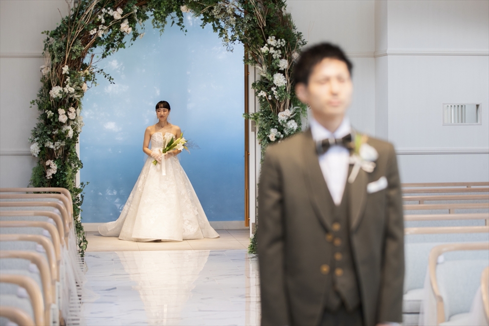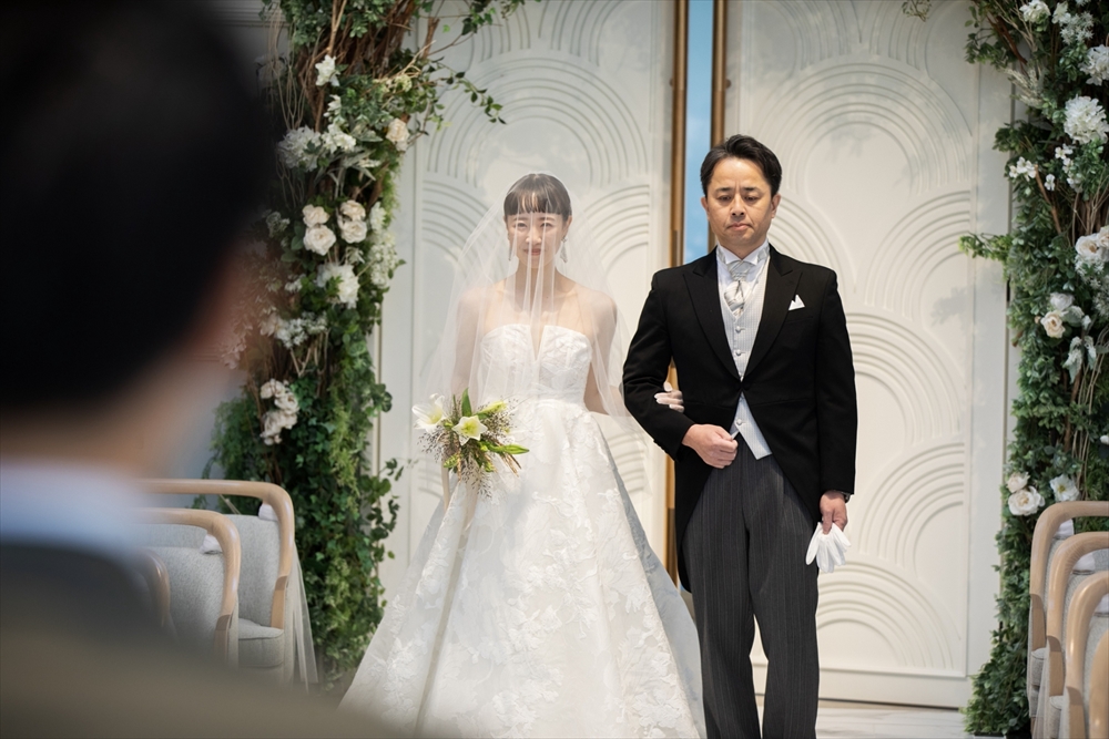 新郎入場はグローブ&チーフセレモニーを行い、新婦入場は両親と3人で入場しヴェールダウンを行っていただきました。