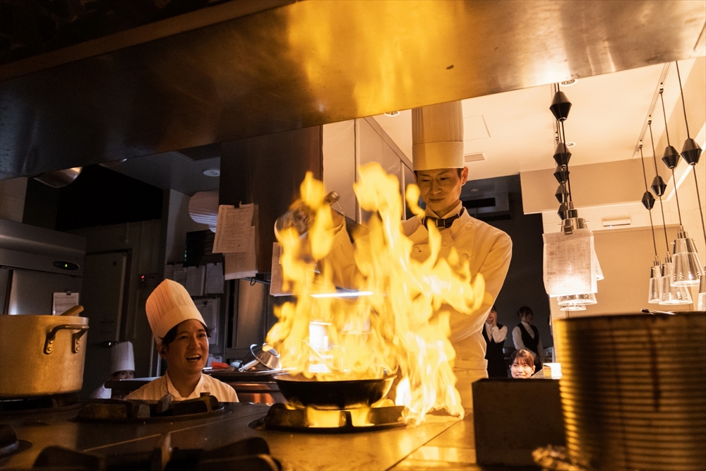披露宴中には、新郎自ら厨房に入り炎の演出「フランベサービス」