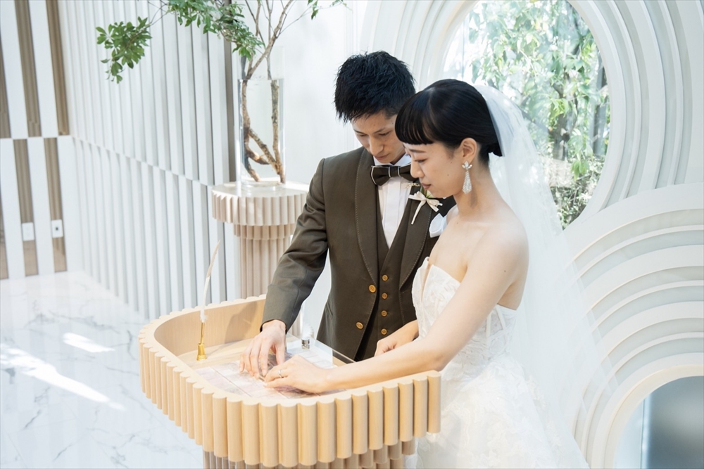 結婚証明書はおしゃれなおふたりにぴったりのアクリルプレートで制作。ラストのピースをはめて完成です。