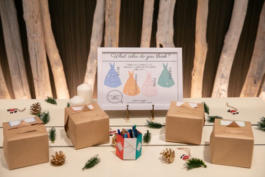 当日は一言で言うと、最高の一日でした!ダーズンフラワーやサンクスバイト、お菓子まきやサンタに変身してプレゼントを渡すなど、大人ゲストだけでなく子どもゲストも楽しめる内容を考えました。結婚式は、いつも言えない思いをいろんな人に伝えられる良いきっかけとなり、それが伝わってとても嬉しかったです。大好きなゲストに囲まれて、祝福していただき、本当に幸せに感じています。