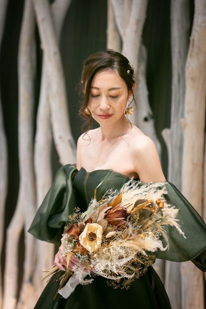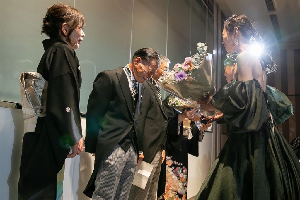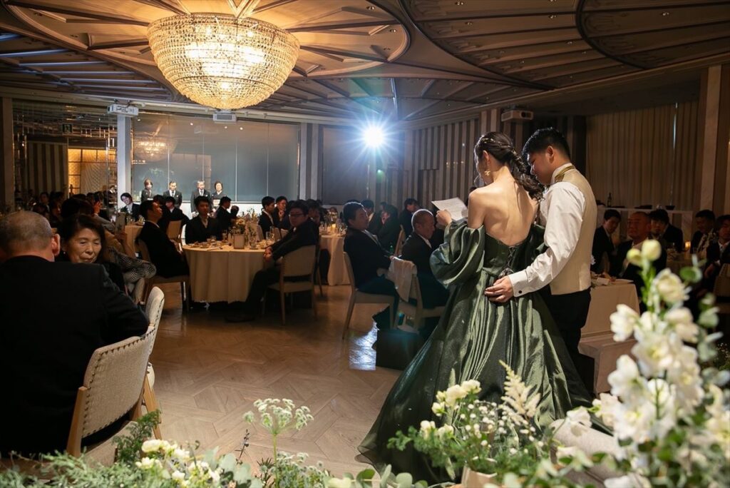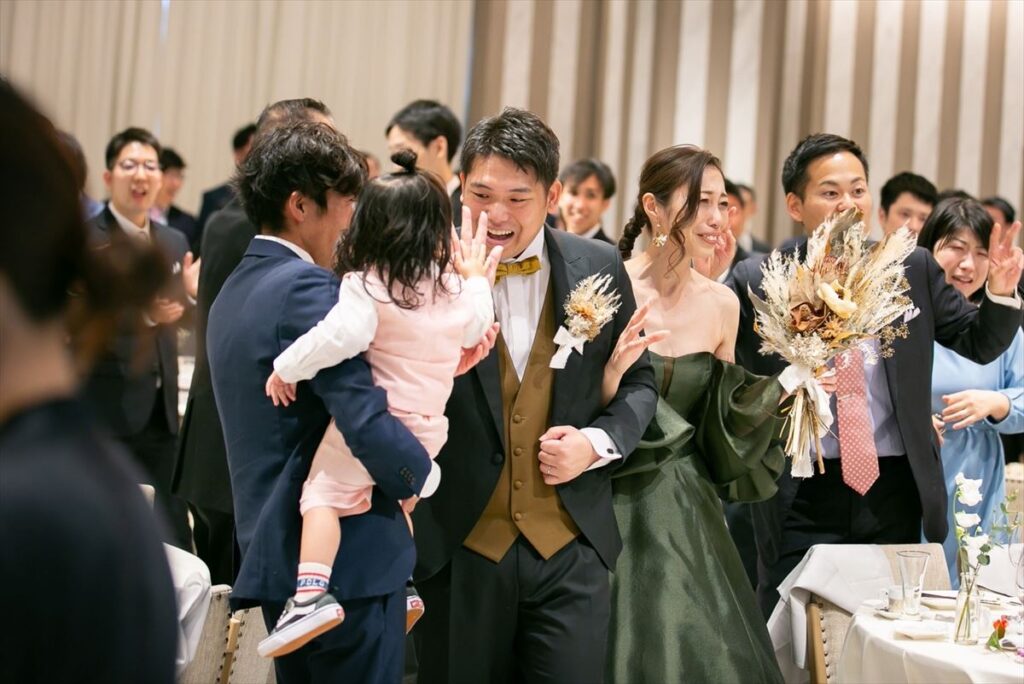 おふたりの結婚式の見どころはやっぱり一番はリメイク入場です!サンタの姿をしたしんやさんの登場に会場全体がワッと盛り上がりました。そしてその後プリンセスのように中庭からグリーンのドレスで登場したりなさんは、本当に美しかったです。お子様にもプレゼントを配っていただき、年齢関係なく楽しんでもらえるワンシーンだったと思います。そしてもう一つの盛り上がりポイントはお菓子まき!こちらもどんな年齢層の方も盛り上がれる大イベントでした。また、想いが一つになったシーンは挙式でのダーズンローズです。おふたりの想いを伝えた上で持ってきていただいた一輪一輪のお花たちでできたブーケは、ゲストの想いがこもったものになったはずです。