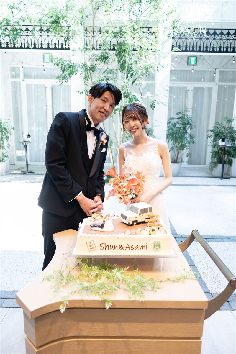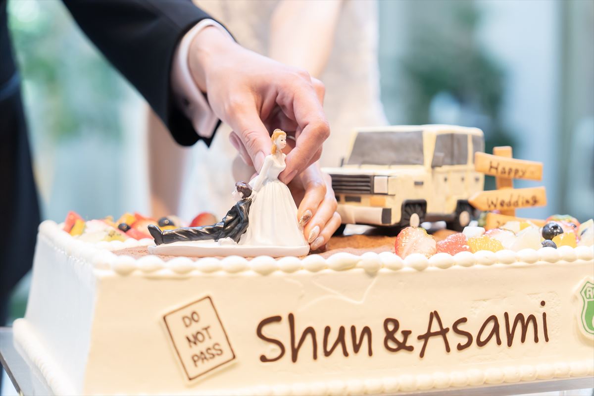 メインイベントのケーキセレモニーではおふたりの愛車がのったインパクトのあるケーキが登場します