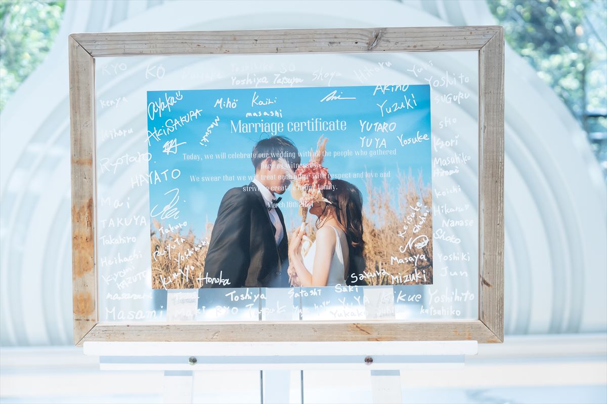 一言で言うと、わたしたちらしさのある素晴らしい一日にすることができました。当日は音楽とともに思い出を残したかったので、BGMにとてもこだわりました。ウエディングケーキは個性を出すために愛車を乗せたデザインにしました。また、プロフィールブックは雑誌風のデザインにし、オープニング&プロフィールムービーも演出の一つとしてすべて自分たちで作成しました。エンドロールは当日の自分たちやゲストの方々の表情が残っているので見返すと当日の気持ちを思い出すことができたので、お願いしてよかったです。ゲストに楽しんでもらうことや両親に感謝を伝えるということもどちらも叶えられ、式の後にはゲストから「とても良い式だったよ」と言ってもらえました。