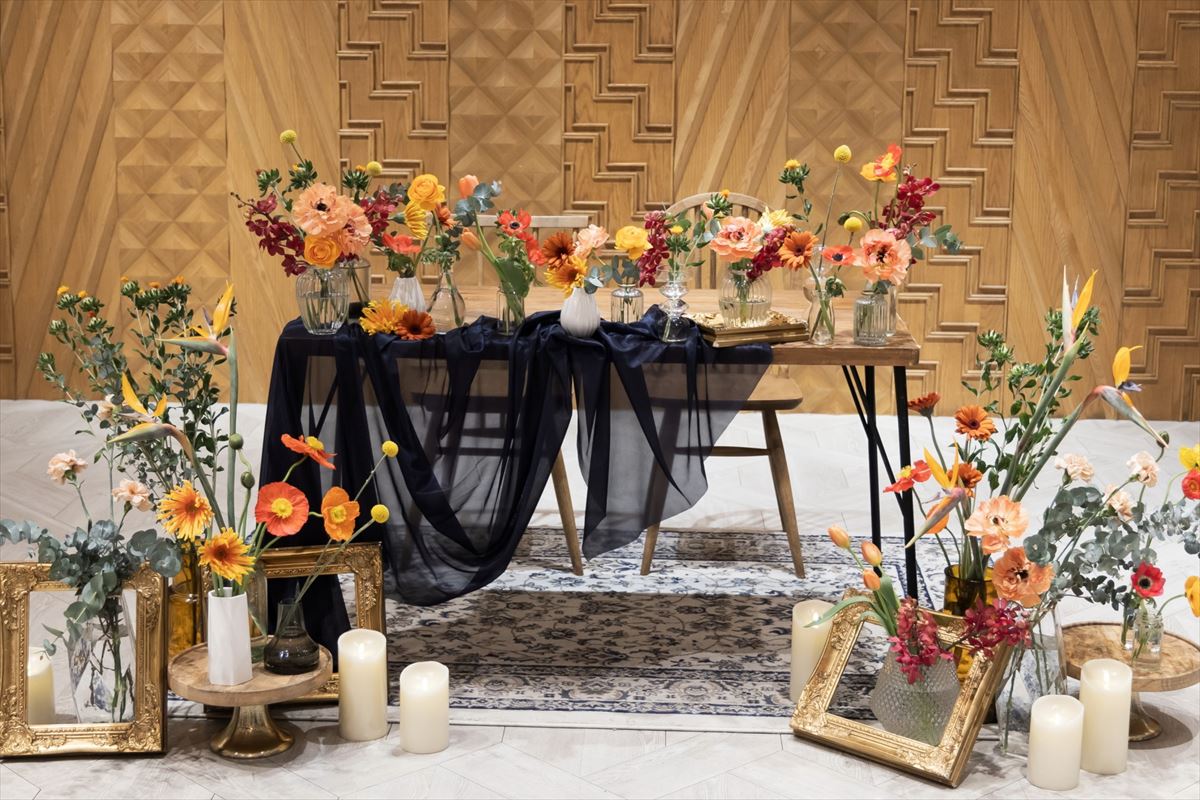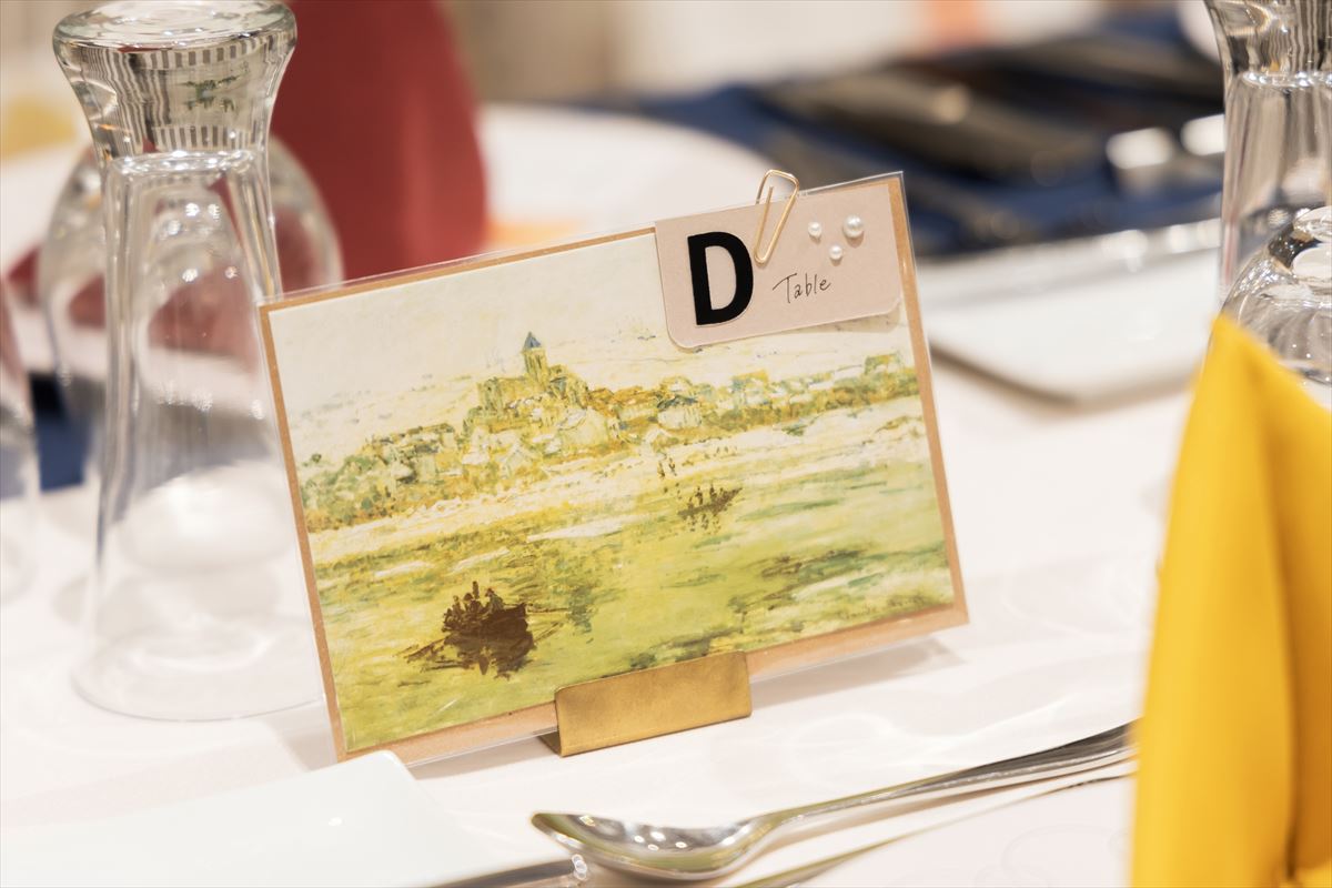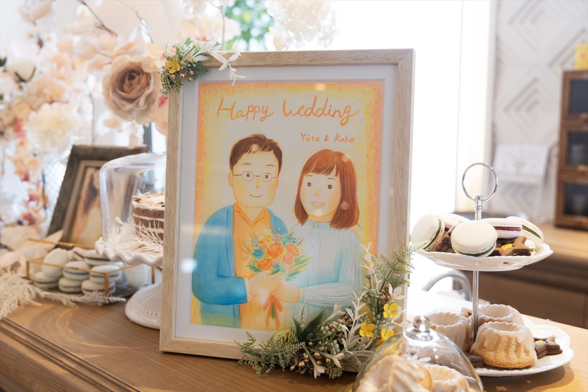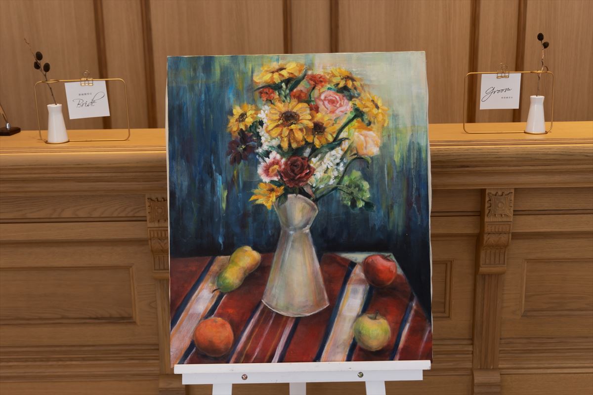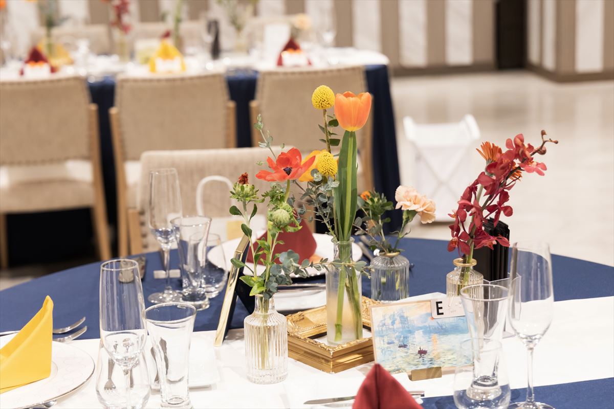 当日の季節が春ということで、お花を主軸にアイテムなどとてもこだわりました。お花をモチーフにした著名画家達の絵画や、額縁、新婦の作品も取り入れ、よりテーマを固められました。メインテーブルはもちろん、ゲストにもお花が咲いたように笑顔が溢れる一日になるようゲストテーブルにもこだわりのお花を沢山飾りました。スイーツ好きな新郎の大好きなチョコレートケーキと、新婦の好きなギンガムチェックが融合したウエディングケーキは圧巻の出来栄えでした。お越しいただいたゲストから、「センスがいい、一生わすれられない一日だった」とのお声を沢山いただきました。私達のたいせつな人々が両家の垣根を越えて楽しい時間を過ごされていたことや、何より私達夫婦の「大好き」の気持ちを沢山感じ取っていただけたことが本当に幸せでした。今でも夢のようなあの時間を思い返しては、余韻に浸っています。